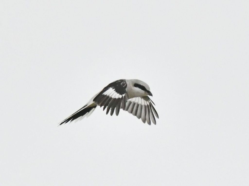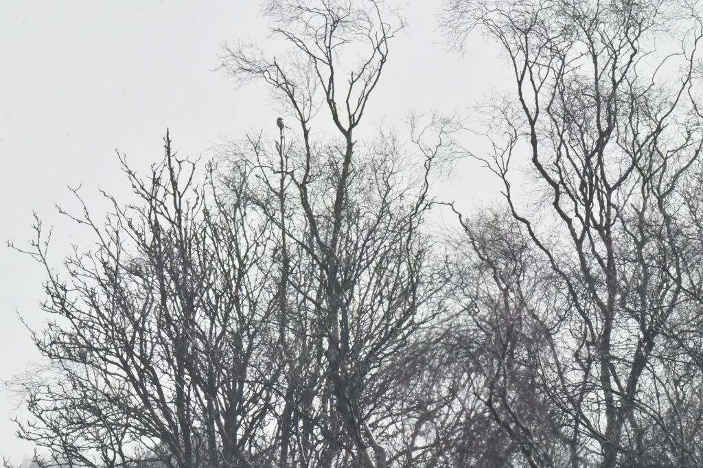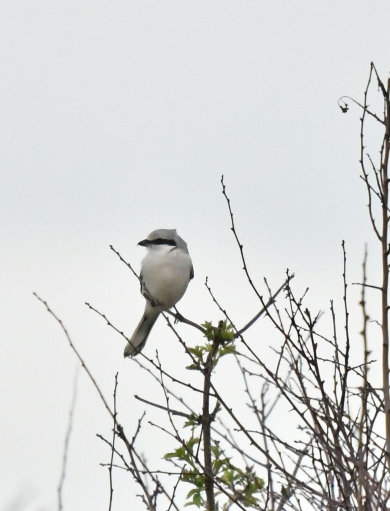 The bird in the picture is a great grey shrike. They are rare winter visitors to the UK: there have only been about 60 individuals in the whole country over this Winter, mainly in the south and the east. Twitchers will travel halfway across the country to see one if it is reported on a birding blog. So last year I got very excited when one decided to stay for a few weeks on the edge of the woods about 4 miles from my house. I did get to see it, perching in a distant tree, and treasured the photograph below that I got – as you can see, it was hardly one you would put in a frame and hang on the wall. (The bird is about a quarter of the way down, slightly left of centre.)
